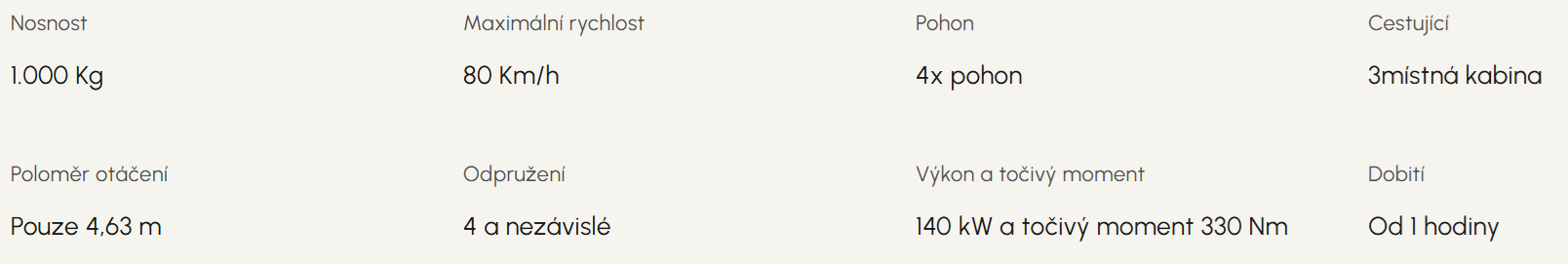 Není příliš objemný jako běžná dodávka o hmotnosti 3,5 t, ale je dostatečně velký, aby zajistil nosnost 1000 kg (např. 2 palety) a snadnou manévrovatelnost v omezených prostorech. Minimální poloměr otáčení 4,63 m usnadňuje práci v malých prostorech.