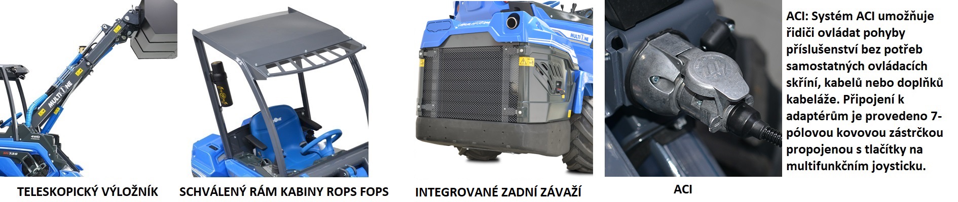 (*) Pozn.: Je to maximální náklad, který lze zvednout těsně od země, když je stroj rovně, obsluha stroje v kabině, s maximálním zadním závažím a na pevném, rovném povrchu. Výložník je zasunutý. Nosnost je počítána včetně hmotnosti adaptéru (např. paletové vidle)